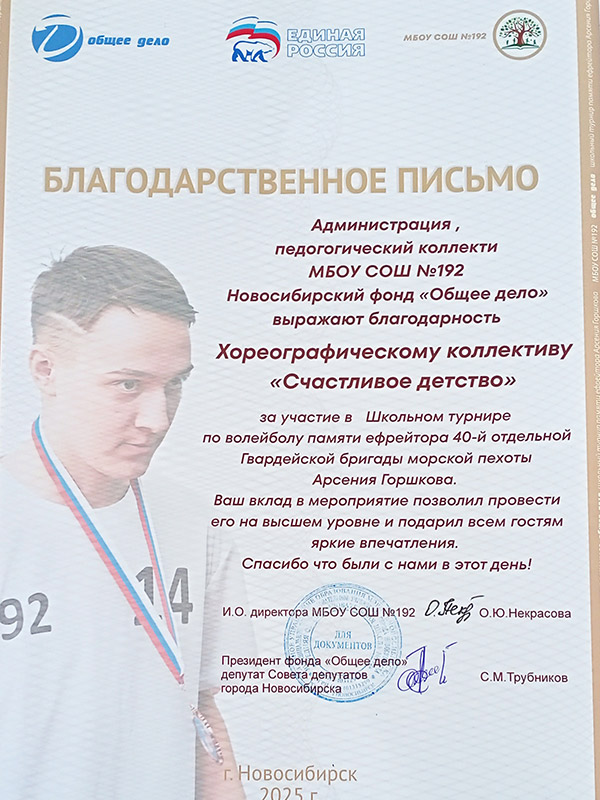 18 октября 2025 г. в МБОУ СОШ 192 прошло открытие Школьного турнира по волейболу памяти ефрейтора 40-й отдельной Гвардейской бригады морской пехоты Арсения Горшкова. Мероприятие проводится при поддержке Новосибирского фонда "Общее дело".