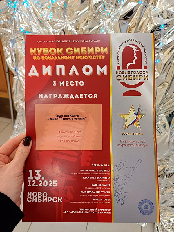 13 декабря на сцене ДК "Октябрьской революции" г.Новосибирска прошел межрегиональный вокальный конкурс "Кубок Сибири по вокальному искусству", который в этом году носил особенное название - "Новые голоса Сибири". Это событие, организованное при поддержке Министерства культуры Новосибирской области в рамках грантового конкурса, стало настоящим праздником для всех любителей музыки и, конечно же, для самих участников.