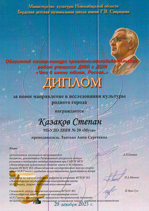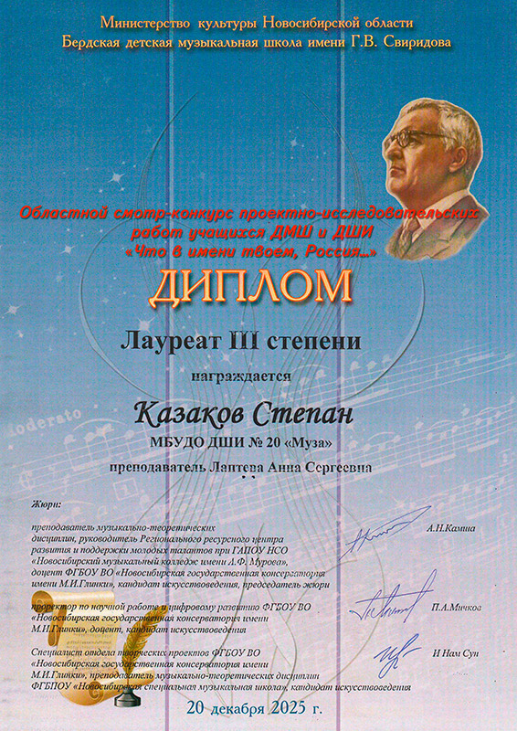 20.12.2025 учащиеся преп. Лаптевой А.С. приняли участие в областном смотре-конкурсе проектно-исследовательских работ "Что в имени твоем, Россия..." среди учащихся ДШИ и ДМШ (г.Бердск) и стали Лауреатами III степени, а Степан отмечен также специальным дипломом.
