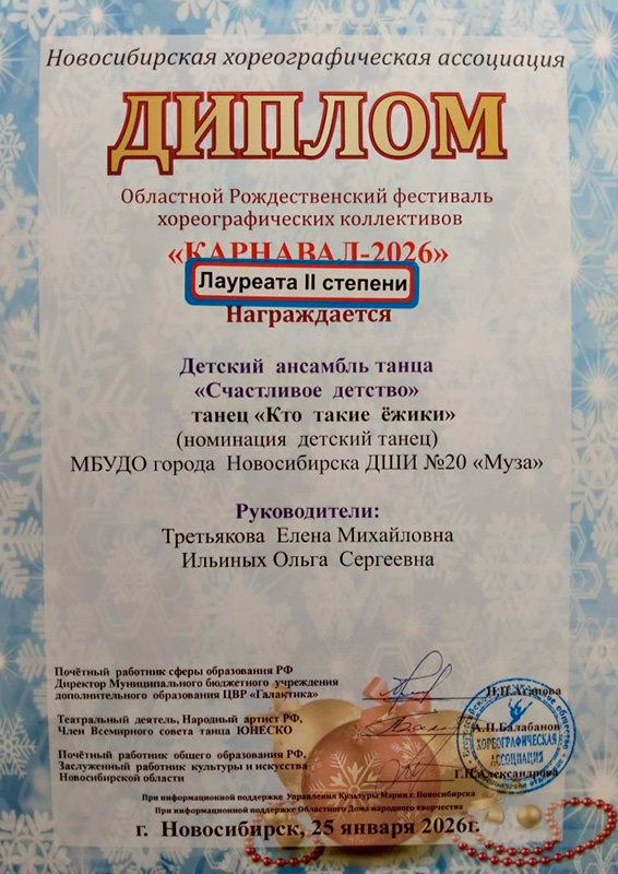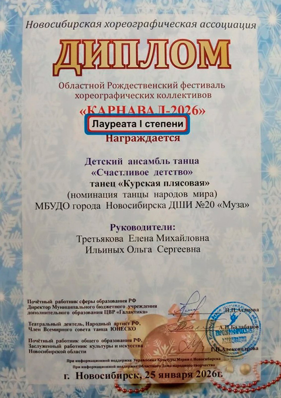 В январе месяце в Областном Рождественском фестивале хореографических коллективов "Карнавал-2026", ансамбль "Счастливое детство" выступил с дебютом русского народного танца "Курская плясовая", за который получил диплом Лауреата 1-ой степени. Младший состав награждён дипломом Лауреата 2-ой степени.